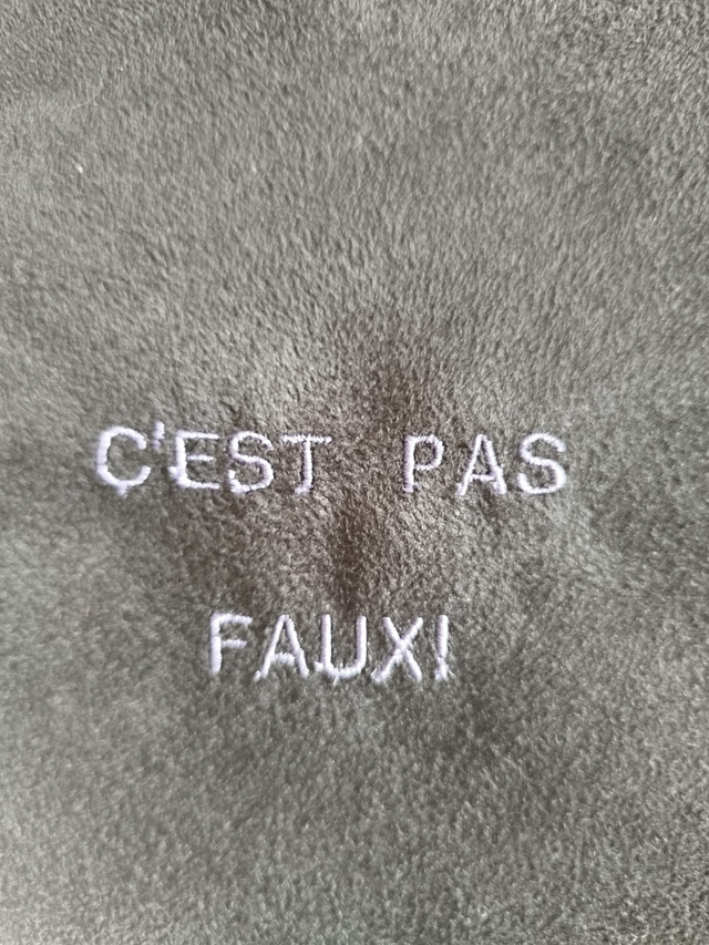 Une face est brodée "C'EST PAS FAUX !" pour les messages subliminaux :), un discret drapeau tricolore est cousu sur le côté.