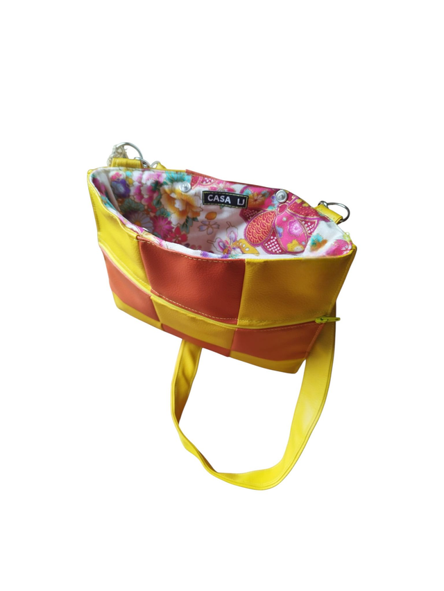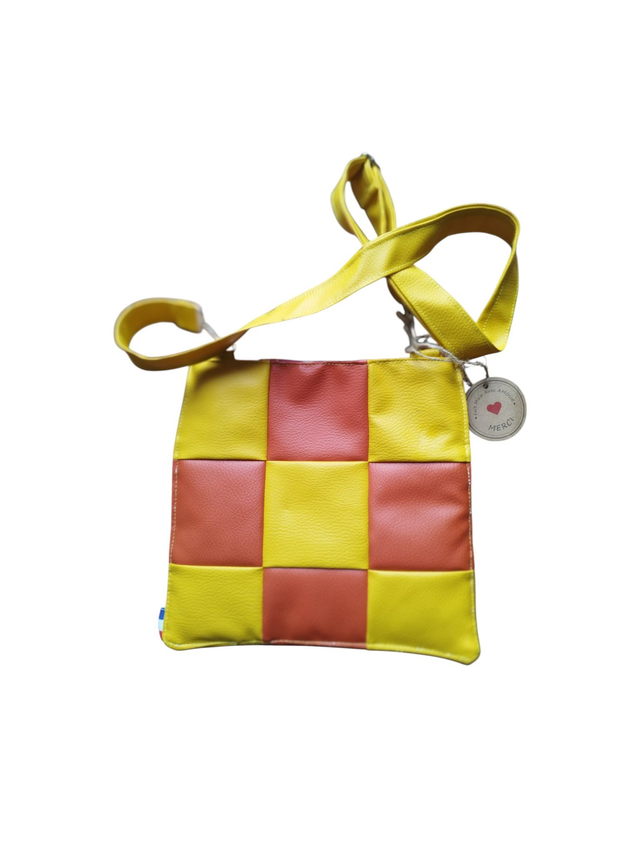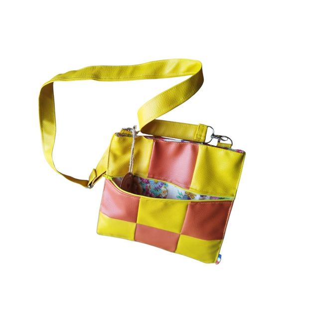 Grande pochette XXL carrée en patchwork de simili cuir bicolore orange et jaune