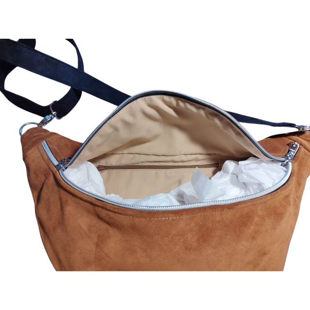 L'intérieure est en nylon marron clair, avec une grande poche zippée de 17 cm