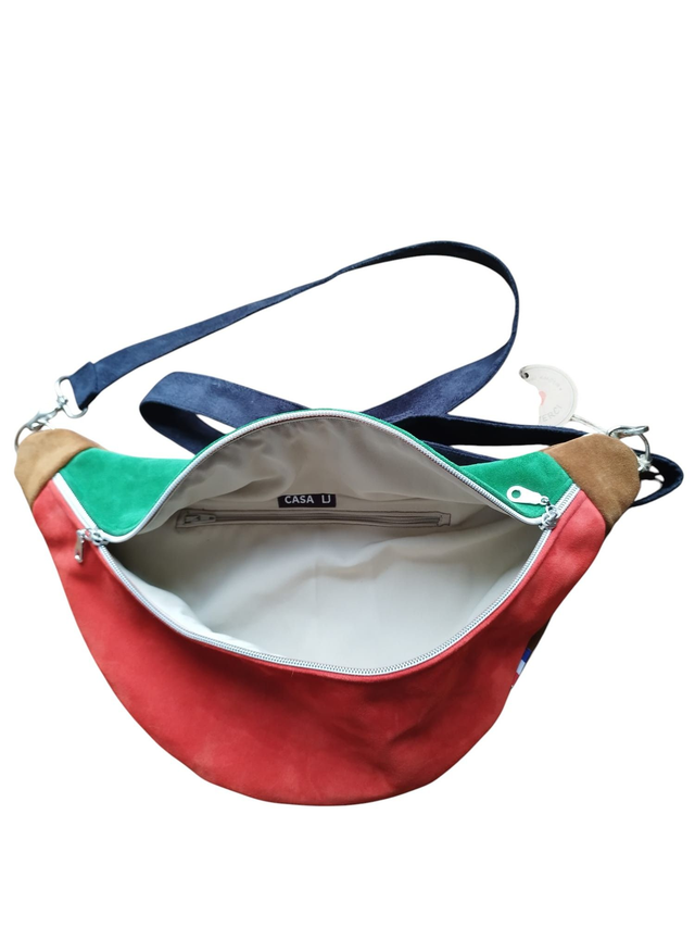 Sac banane en cuir de vachette tricolore rouge vert et marron