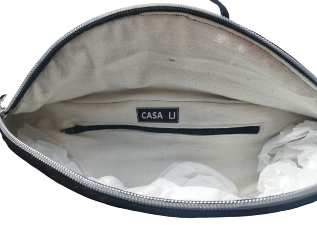 L'intérieure est coton épais écru de qualité, avec une grande poche zippée de 17 cm