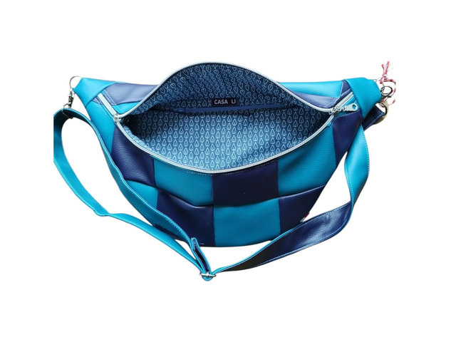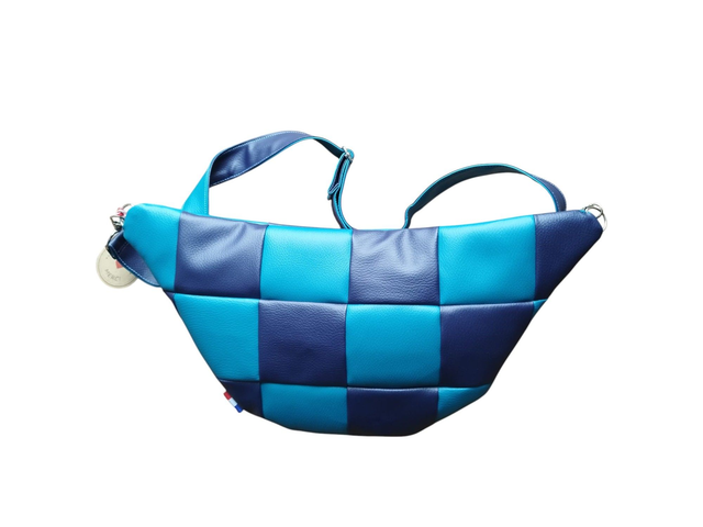 Magnifique sac banane original en patchwork de simili cuir bicolore bleu clair et foncé.