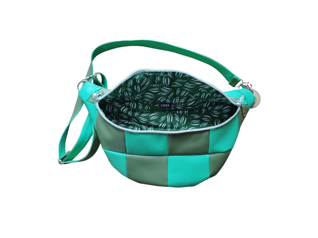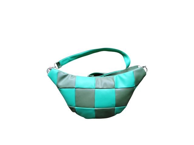 Magnifique sac banane original en patchwork de simili cuir bicolore vert clair et kaki
