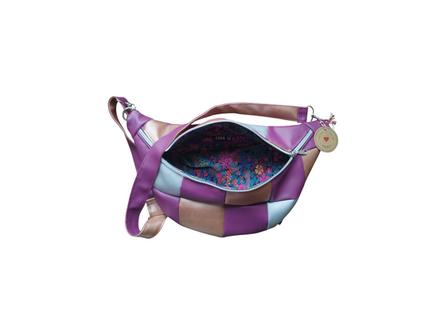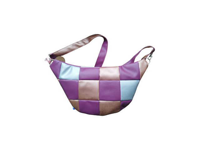 Magnifique sac banane original en patchwork de simili cuir tricolore violet, rose nacré et argent