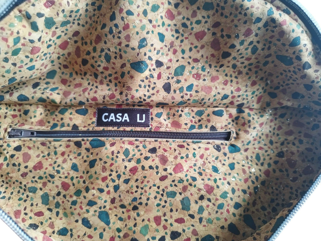 L'intérieur est en tissu liège, avec une grande poche zippée de 17 cm