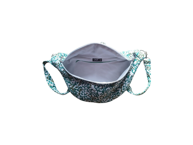 Sac banane très original dans un beau tissu luxe jacquard beige vert et bronze doré, avec un zip double curseurs