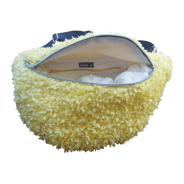 Sac banane très original avec des fleurs jaunes cousues sur une trame, avec un zip double curseurs