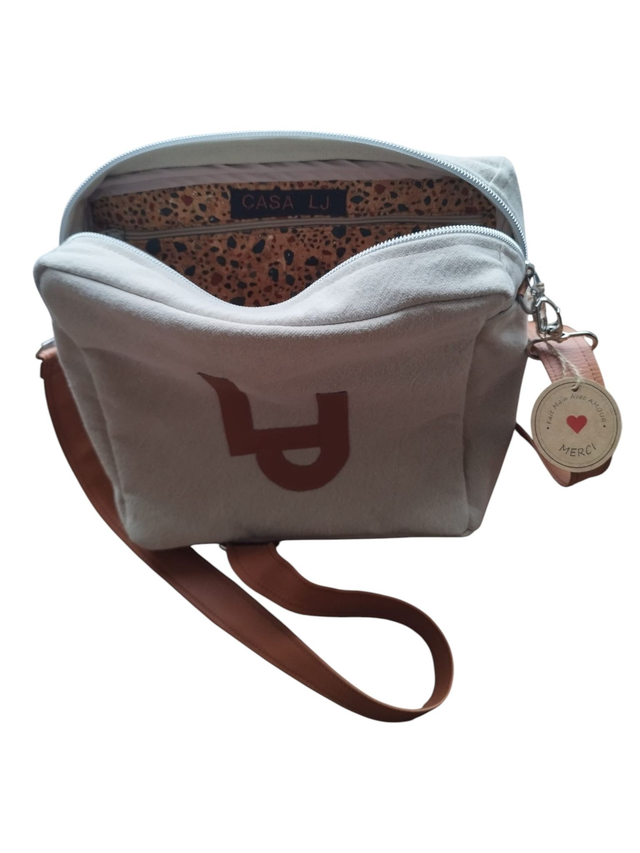 Une jolie besace en coton écru et épais de 22x22 cm avec un zip de 30 cm double curseurs pour une grande ouverture !