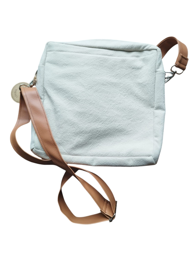 Sac besace en coton épais écru intérieur en liège et bandoulière en simili cuir marron
