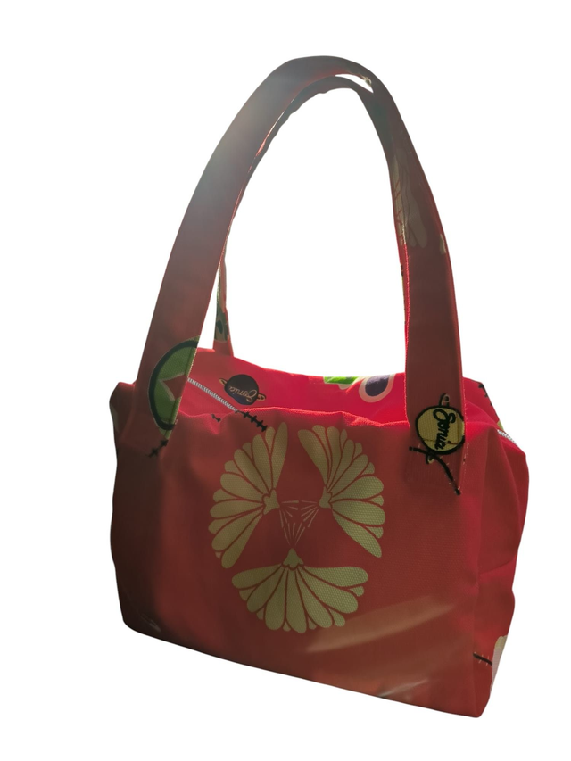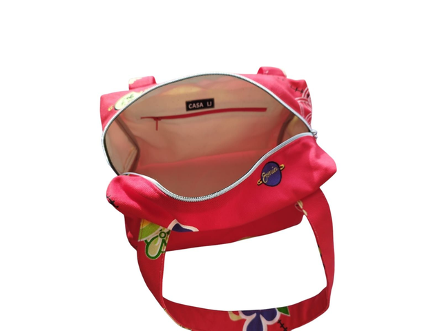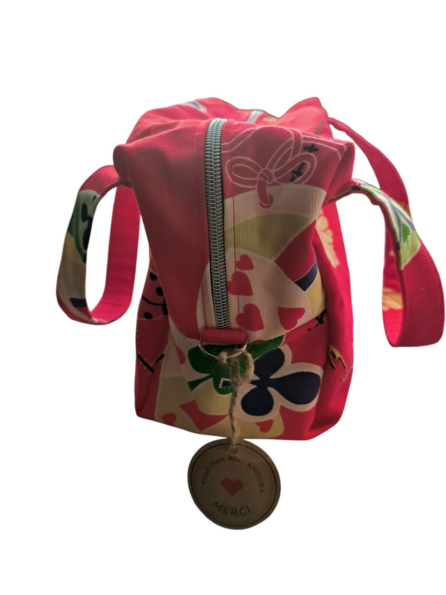 Un charmant petit sac Boston zippé en coton imprimé rouge épais,