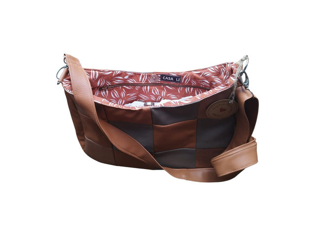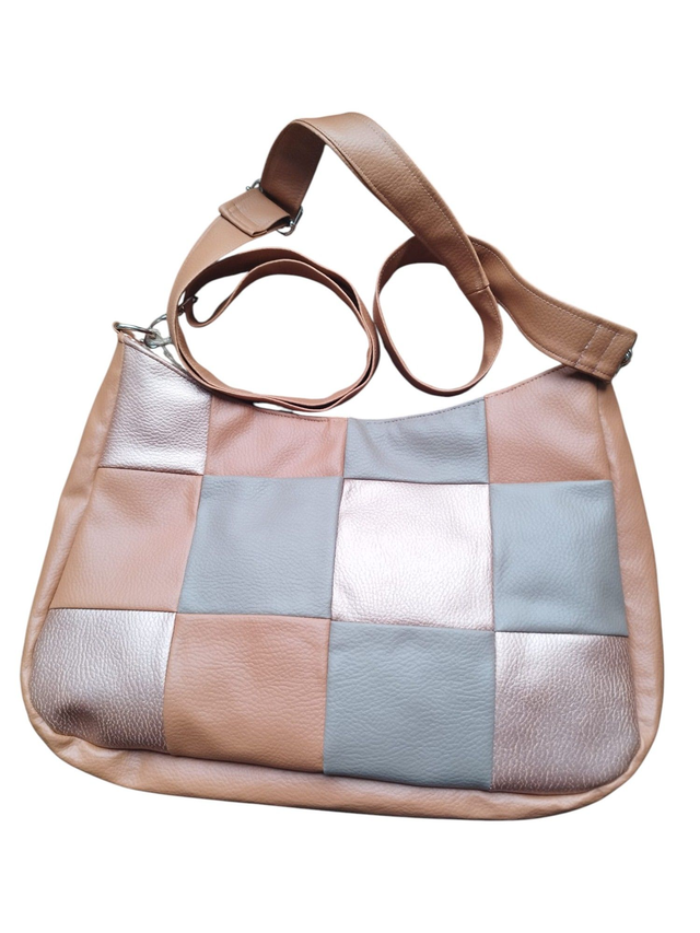 Un sac demi lune original en patchwork de simili cuir de 3 coloris : marron, kaki et rose nacrée